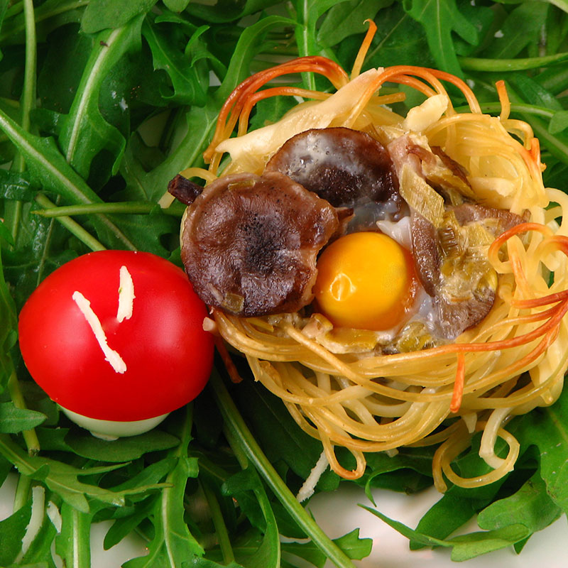 - Gnijezda servirajte na zelenoj podlozi od špinata, rikole ili neke druge zelene salate, a između stavite gljive od prepeličjih jaja i cherry rajčica.